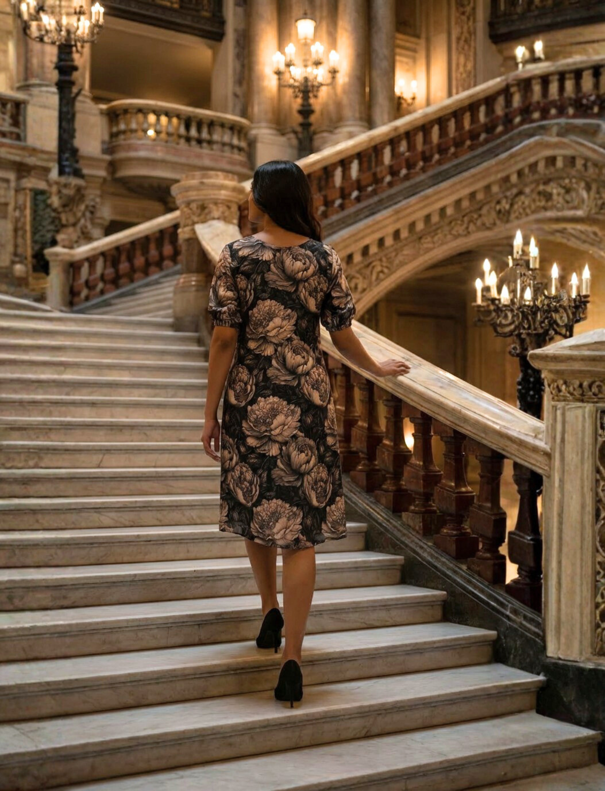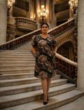 This elegant a-line silhouette dress is crafted from a rich, traditional-inspired woven fabric featuring vibrant floral motifs in shades of black and beige. the dress showcases a distinctive v-neckline, while short sleeves ensure comfort and side pockets add ease and functionality. the silhouette is relaxed and flattering, making it ideal for everyday wear, resort styling, or casual outings.