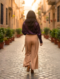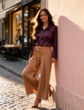 The Classic Era Set features a rich wine satin shirt paired with elegant camel brown wide-leg trousers, creating a sophisticated and contemporary ensemble. The wine satin shirt showcases a sleek double placket design with subtle front tucks that create a clean, structured fall, enhancing the natural sheen of the fabric. Classic full sleeves with crisp cuffs add timeless refinement.