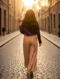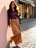 The Valora Pleat Trousers are elegant and contemporary camel-brown trousers featuring a wide-leg silhouette with deep front and back box pleats that create graceful movement and volume. Designed with a high-rise waist, these trousers include a sleek side tie-up belt detail that adds a feminine touch to the structured look. The concealed front closure maintains a polished, refined finish, making them suitable for both casual and semi-formal occasions. With a comfortable overall fit, they offer the perfect blend of sophistication and ease for a chic, modern outfit.