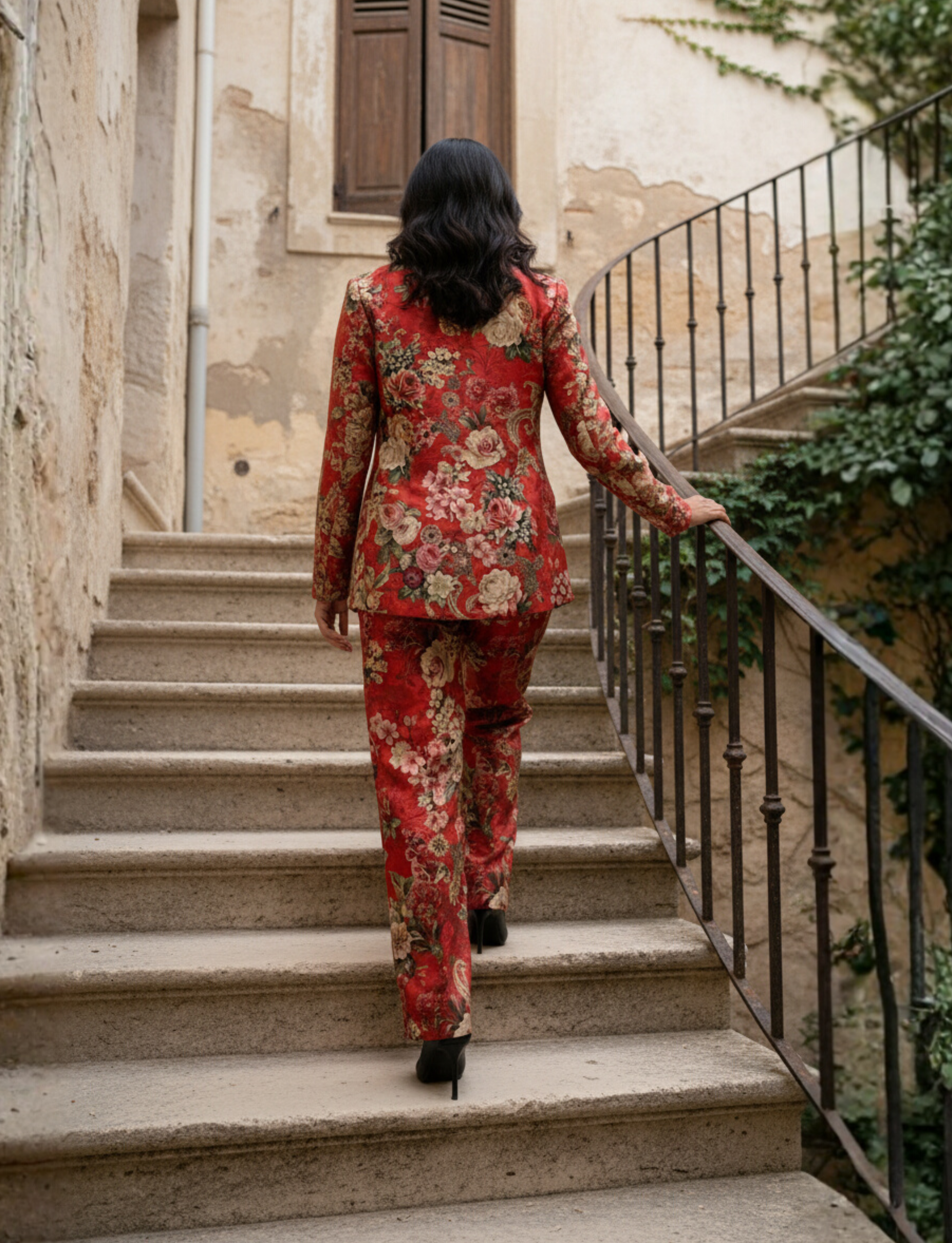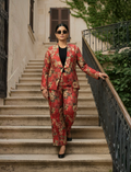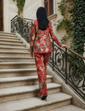 This striking blazer set features a red base with an all-over floral print, showcasing rich botanical motifs like roses and foliage. The blazer comes in a straight, semi-structured silhouette with full-length sleeves and a clean, collarless open front, keeping the look contemporary and elegant. It is paired with wide-leg pants in the same fabric and print, giving the outfit a coordinated yet bold statement look. Perfect for festive gatherings, evening events, or creative workwear, this ensemble beautifully blends luxury with comfort.